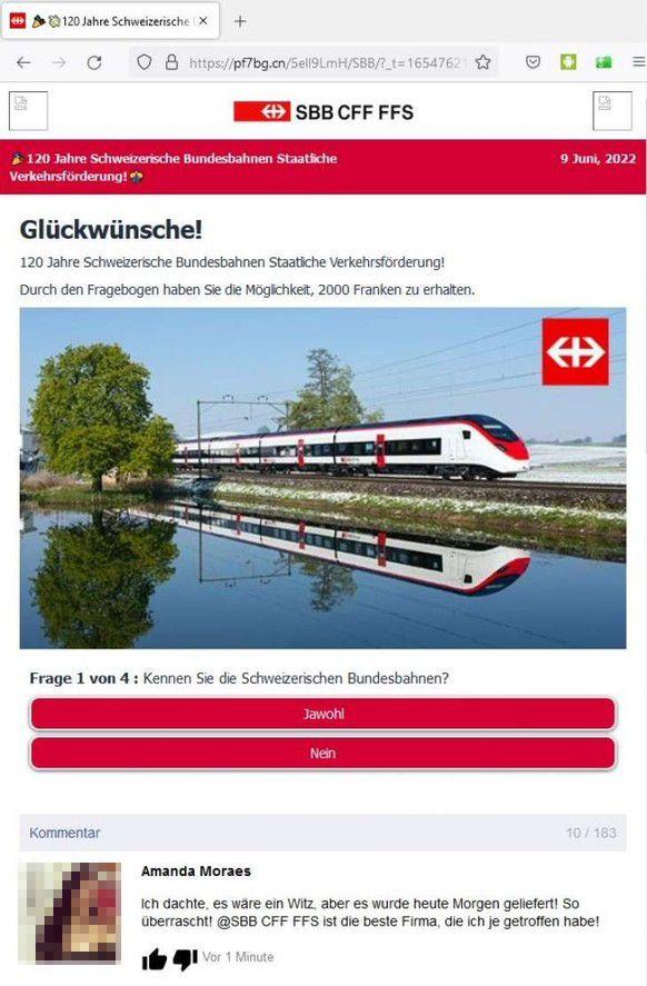 Abb. 2: Der Link aus der Whatsapp-Nachricht leitete zu dieser Fake-SBB-Webseite mit Fake-Kommentaren weiter