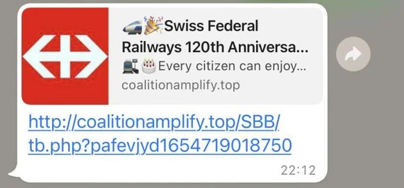 2022 gab es zahlreiche Meldungen über eine WhatsApp-Nachricht, die ein angebliches Gewinnspiel der SBB bewarb. In der Nachricht hieß es, dass man zum 120-jährigen Jubiläum der staatlichen Verkehrsförderung die Möglichkeit habe, 2000.- CHF zu gewinnen. Nachdem man vier einfache Fragen beantwortet hatte, musste man erraten, in welchem der zur Auswahl stehenden Päckchen sich das Geld versteckt. Es war nicht überraschend, dass man in jedem Fall gewann.